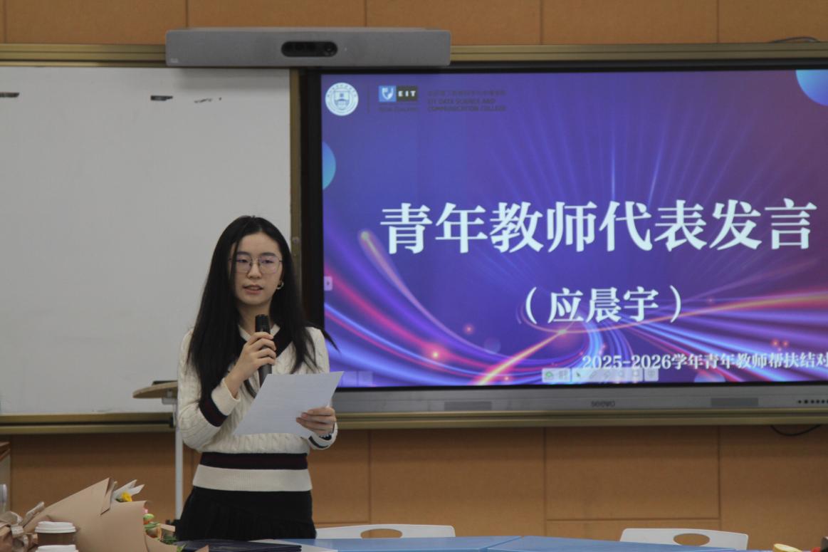 导师代表杨泯萱老师在发言中表示,她将毫无保留地分享自己的教学经验和科研心得,助力青年教师快速成长。同时,她也鼓励青年教师们勇于创新,敢于挑战,共同为学院的发展贡献力量。青年教师代表应晨宇则表达了对导师们的感激之情,并承诺将珍惜这次学习机会,努力提升自己的教学水平和科研能力。